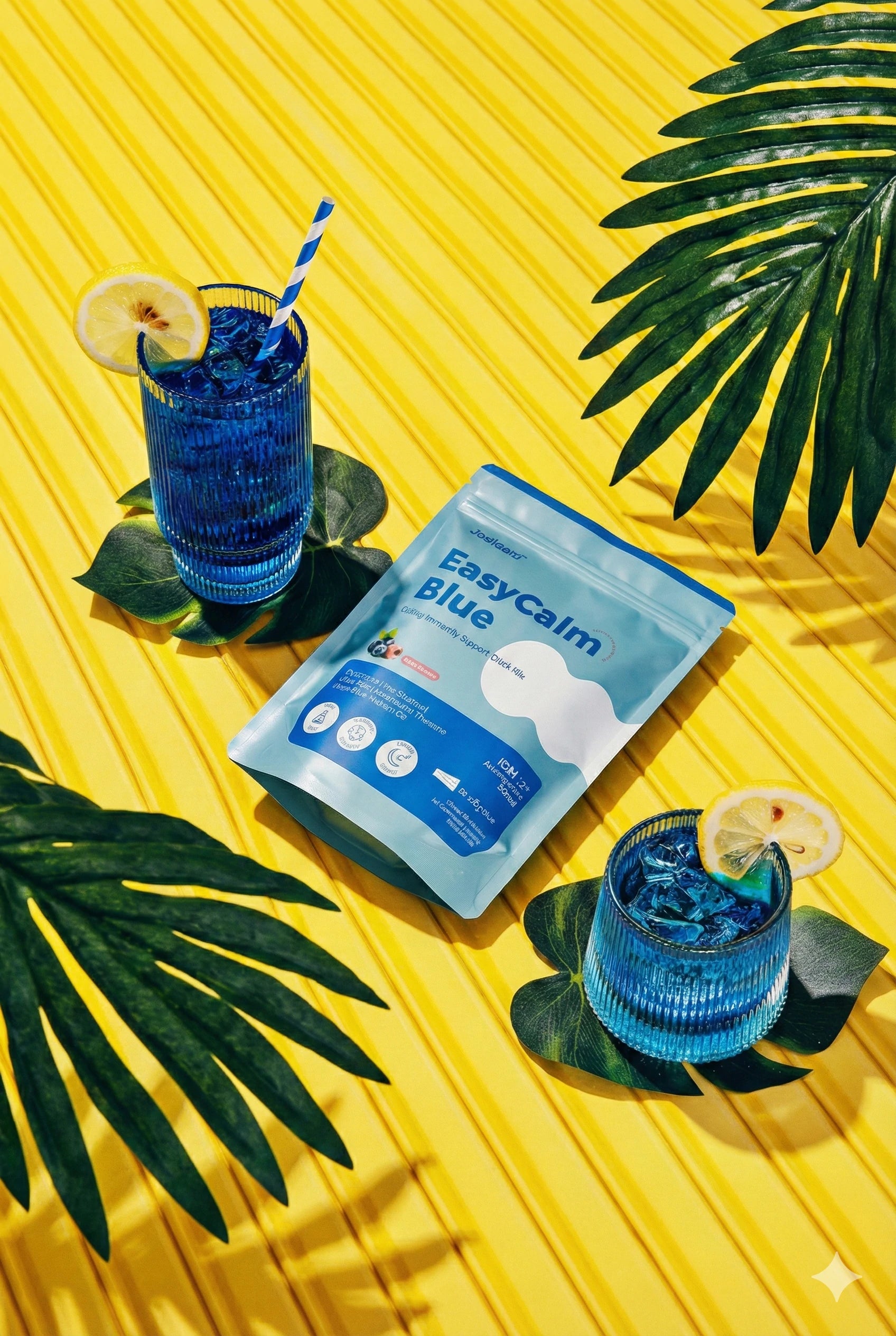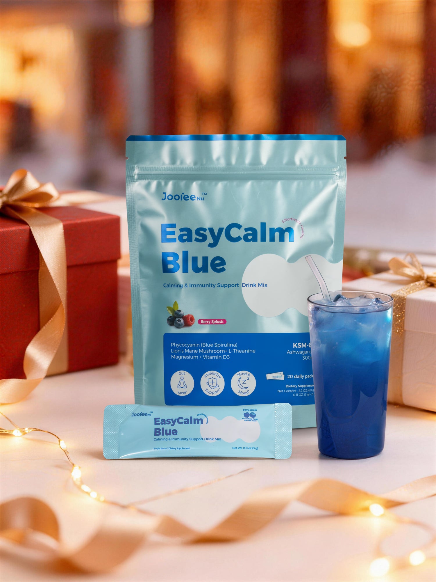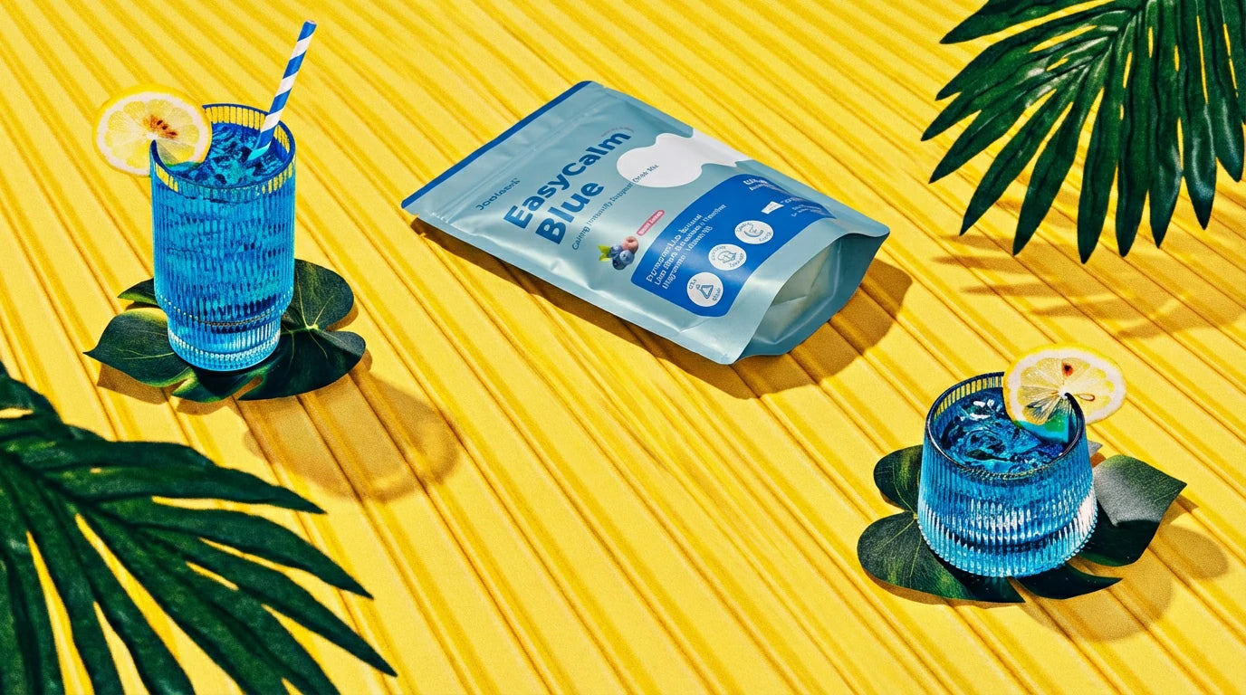 Our "Easycalm Blue" blend combines clinically studied KSM-66® Ashwagandha, Blue Spirulina, Lion's Mane, and Magnesium to support relaxation, mood, and immunity.