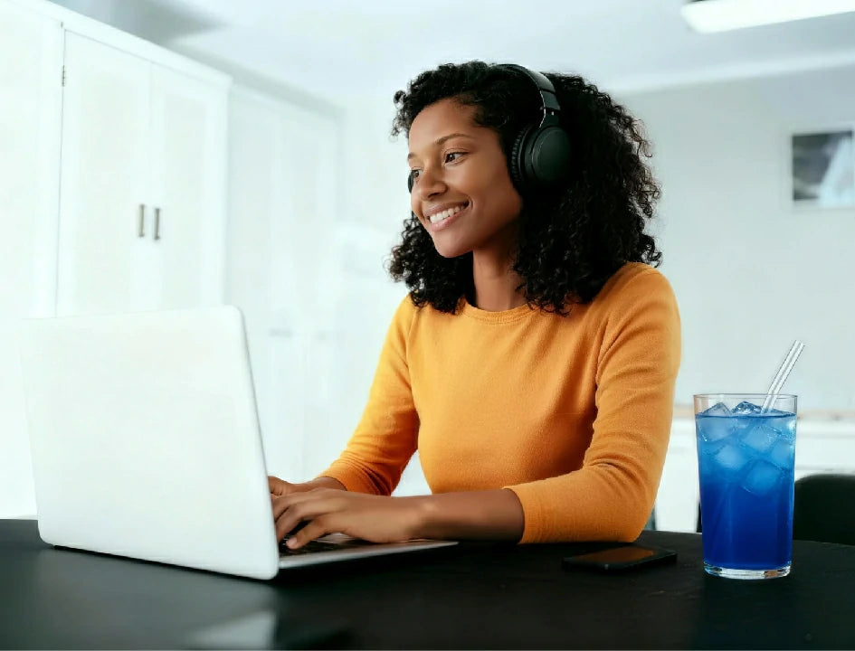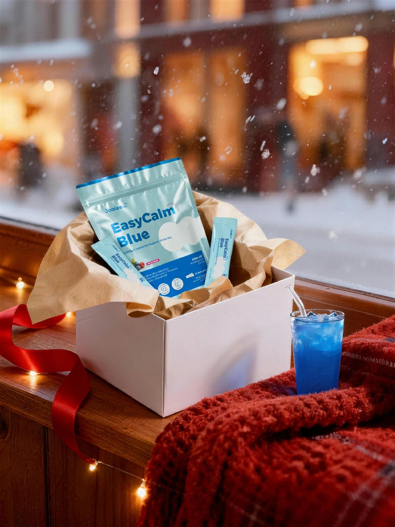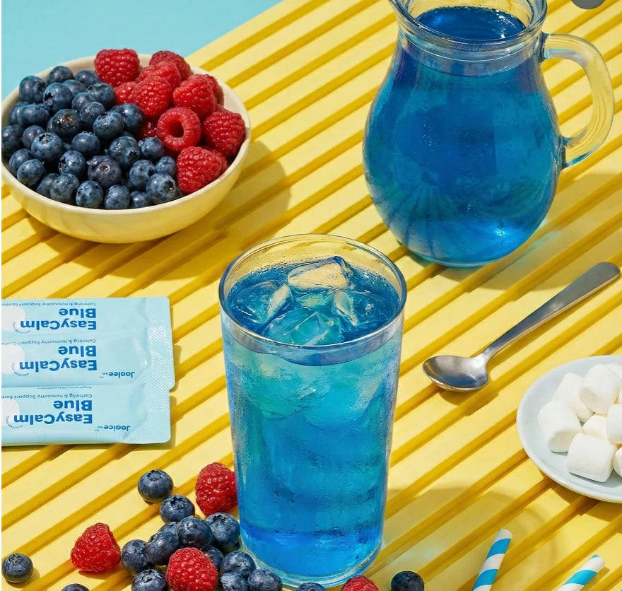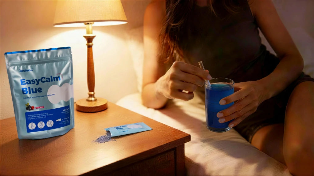 Our "Easycalm Blue" blend combines clinically studied KSM-66® Ashwagandha, Blue Spirulina, Lion's Mane, and Magnesium to support relaxation, mood, and immunity.